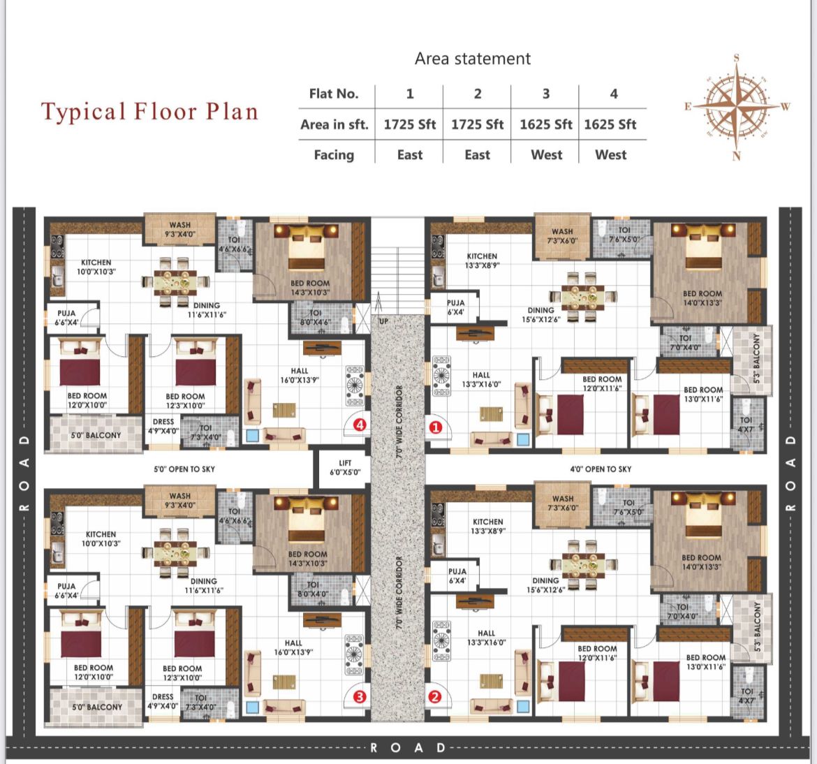 Sri Vasista Homes has been planned to give families both privacy and togetherness. Each floor has 4 flats — 2 East-facing and 2 West-facing, giving good airflow and natural light. The building has 5 floors, and every home is designed neatly with the right amount of space for living, dining, and bedrooms.